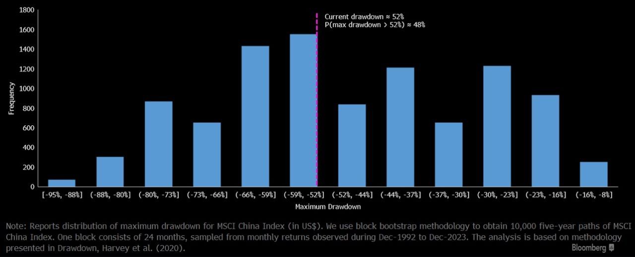 The probability of the MSCI China Index experiencing a 50%-plus maximum drawdown over a five-year period is 51%, during which the index can remain below its previous peak (aka time-under-water) for an average of 35 months. The probability of a 75%-plus maximum drawdown is lower but still significant at 12%, with average time-under-water of 36 months. -BI-