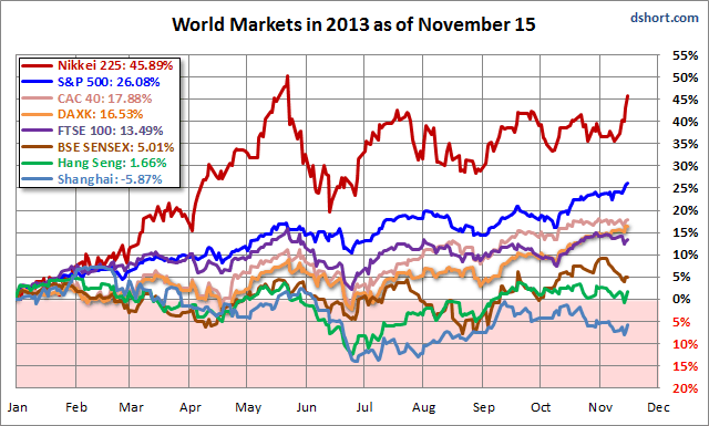 In Japan : Happy Anniversary, Abenomics! A year ago, former Prime Minister Noda called for the elections that brought Shinzo Abe to power. Since then, the Bank of Japan’s balance sheet has tripled, the yen is down 20% against the dollar and MSCI Japan is up 80%. As expected, Japan’s Q3 GDP growth was soft, at 1.9% (annualized), restrained by falling Asian demand rising energy imports. Q4 GDP growth is widely expected to be over 3%.