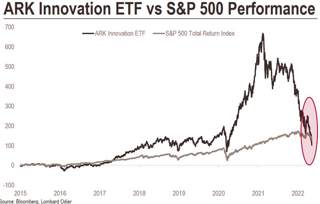 The proxy, or say poster-child, for these companies remains the ARKK Innovation Fund. ARK Invest Fund performance, which is now below the S&P500 returns, is another irrational and painful behavior :
