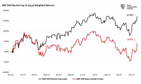 The market capitalization of the top seven stocks is so large that it skews the performance of the index overall. We can see this visually by comparing the performance of the market and equal-weighted S&P 500 indices.