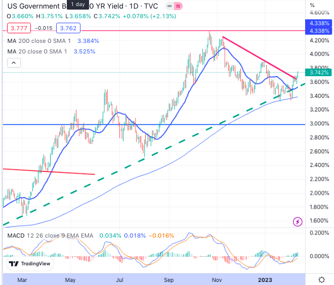 However, likely having had a much larger contribution to the negative performance were rising yields after Friday surprise labour market report. Here’s the chart of the US 10-year yield. Indeed is the yield back to its highest level since late December.