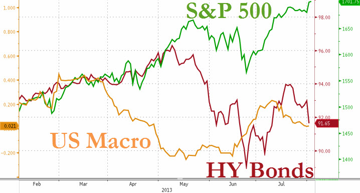 Even with a PMI beat in the US, macro is still sliding (though cognitively noone wants to discuss what is missing expectations)…But equity markets don’t care… all that matters was that the Fed began to lose control so in May, the BoJ stepped in and lifted equities away from reality just a little more… After strong data earlier in the week, the Labor Dpt on Friday said 162,000 jobs were created in July, and that the unemployment rate fell to 7.4%. That’s undeniable progress but somewhat short of market expectations. The jobs data wasn’t the only big piece of economic data in a busy week. The U.S.economy grew 1.7 % in the second quarter faster than many economists anticipated. However, the first quarter growth rate was revised lower.