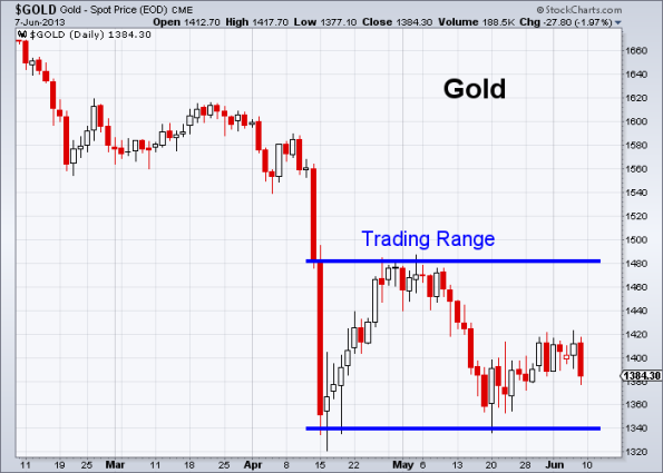 The daily chart shows that the gold index is forming a 8-week horizontal trading range between 1340 and 1480. Prices should be in sideways before a breakout from the trading range.